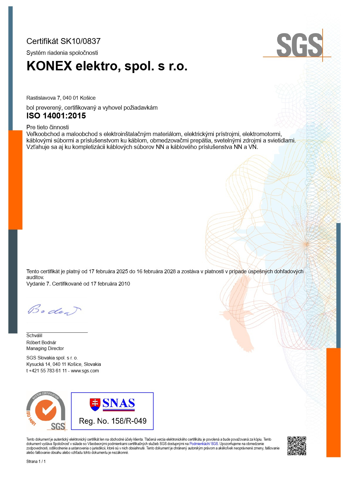 Týmto certifikátom (cert. číslo 14 100 151117) osvedčuje spoločnosť SGS Slovakia s.r.o. Certifikačný orgán pre systémy manažérstva, že spoločnosť KONEX elektro, spol. s r.o. má zavedený systém manažérstva kvality v oblasti nákupu a predaja elektroinštalačného materiálu a káblov. Tento systém spĺňa požiadavky normy ISO 9001:2000. V súčasnosti je certifikovaný podľa požiadaviek novej normy ISO 9001:2015. Prvé vydanie certifikátu prebehlo 8. marca 2002. Kontrola a re-certifikácia prebieha každý rok v súlade s normami ISO.