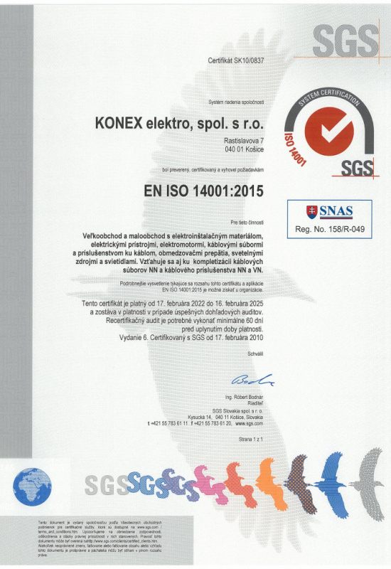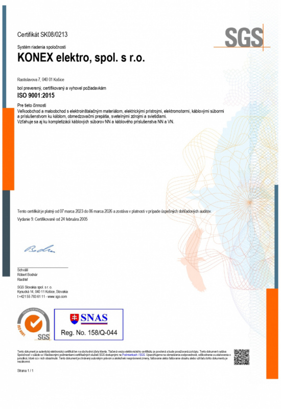 KONEX elektro, spol. s r.o. získala ako jedna z prvých obchodných firiem v oblasti veľkoobchodu s eletroinštalačným materiálom certifikát systému riadenia kvality.